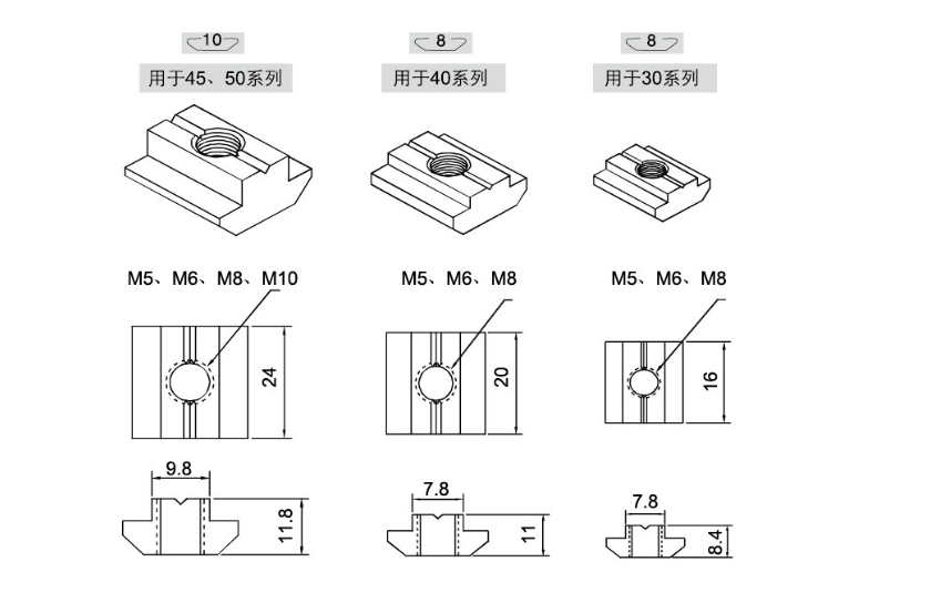 用途:方形螺母塊安裝時需預(yù)塞至鋁型材槽坑內(nèi),用于在型材上連接各種配件。
